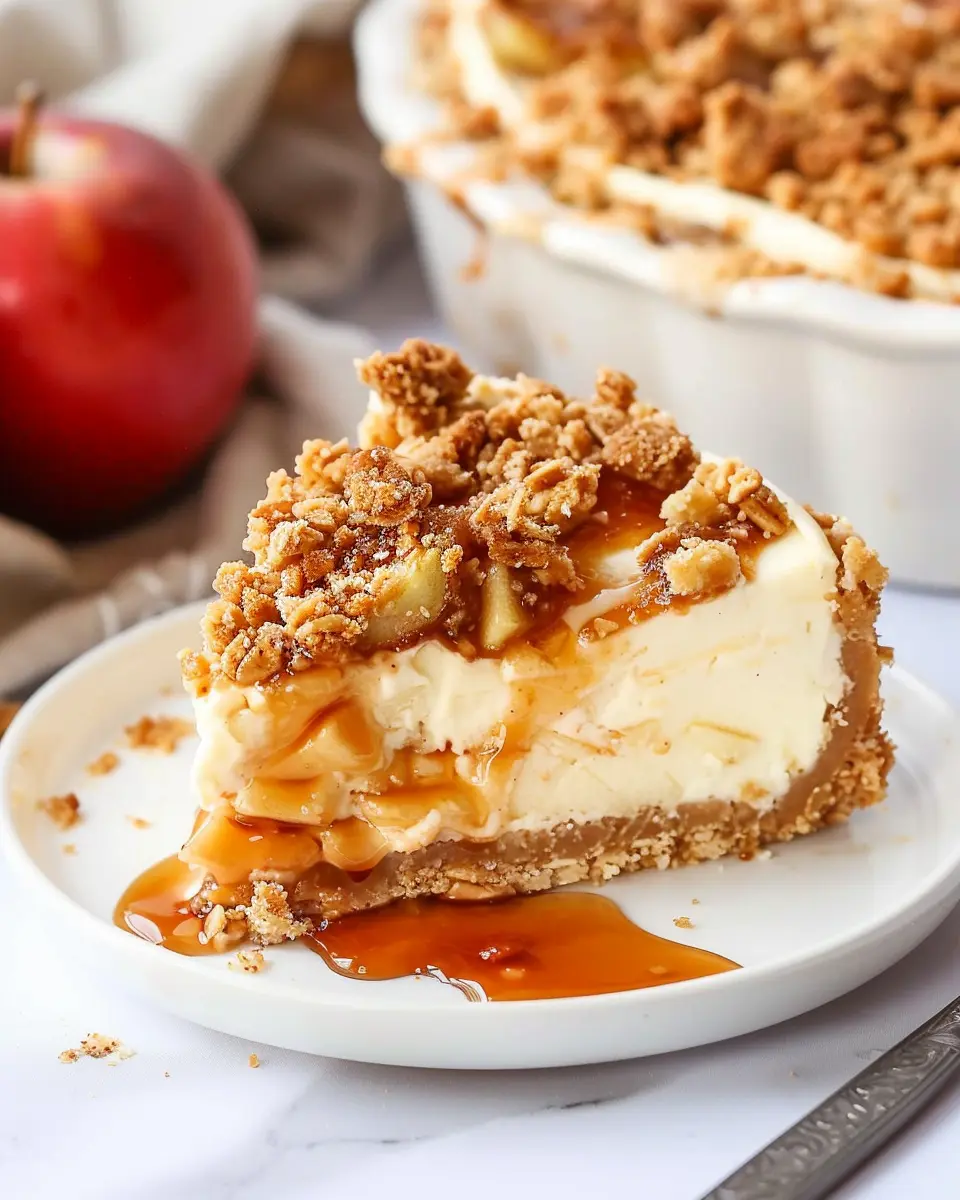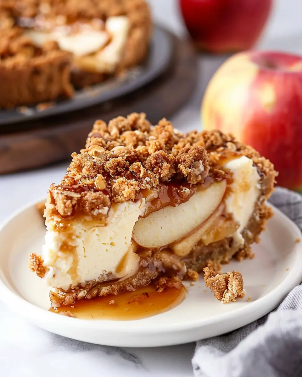 An indulgent dessert perfect for autumn gatherings featuring a creamy cheesecake base topped with a crunchy apple crisp.