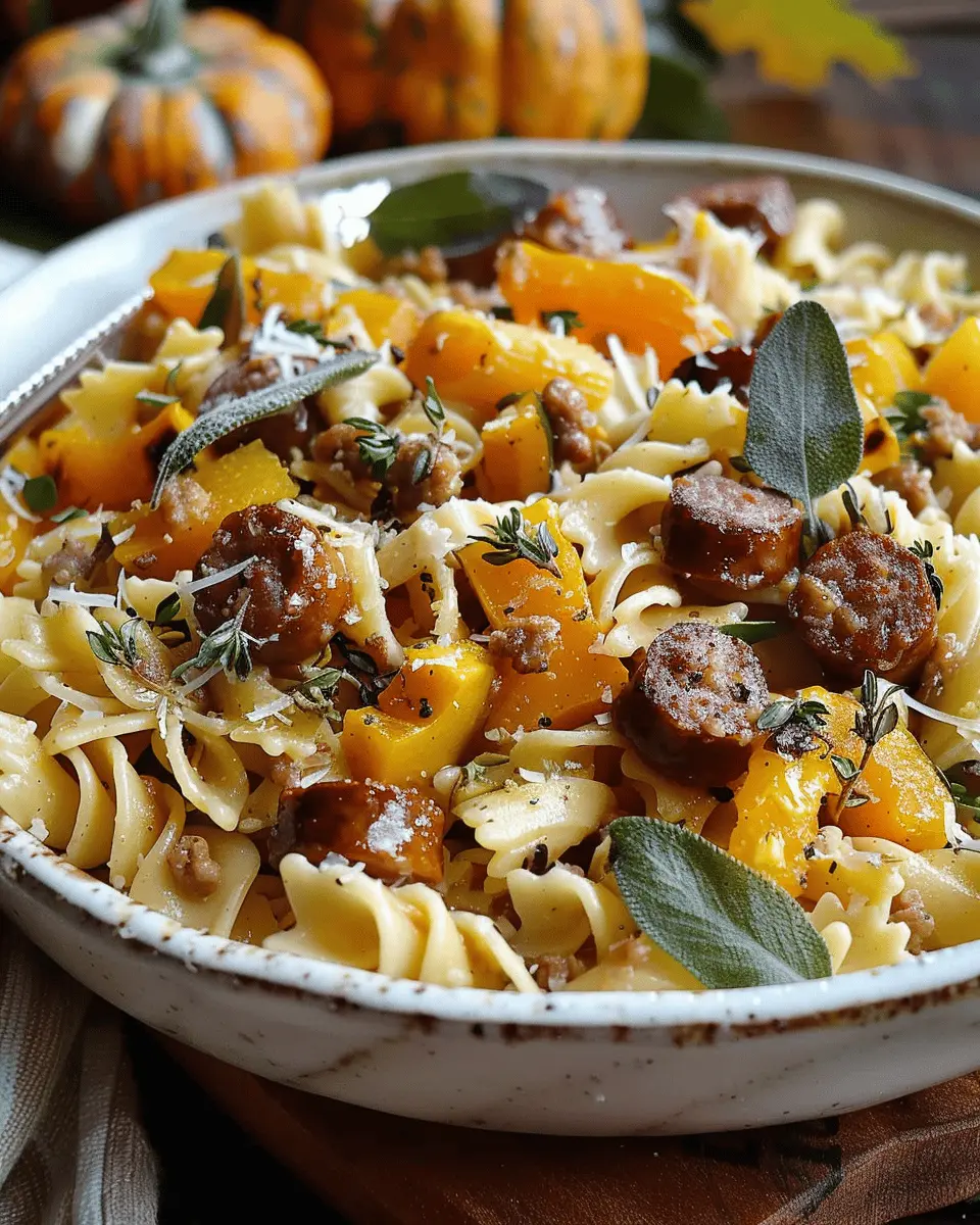 A delicious autumn dish featuring sausage, pasta, and squash for a warm, comforting meal.