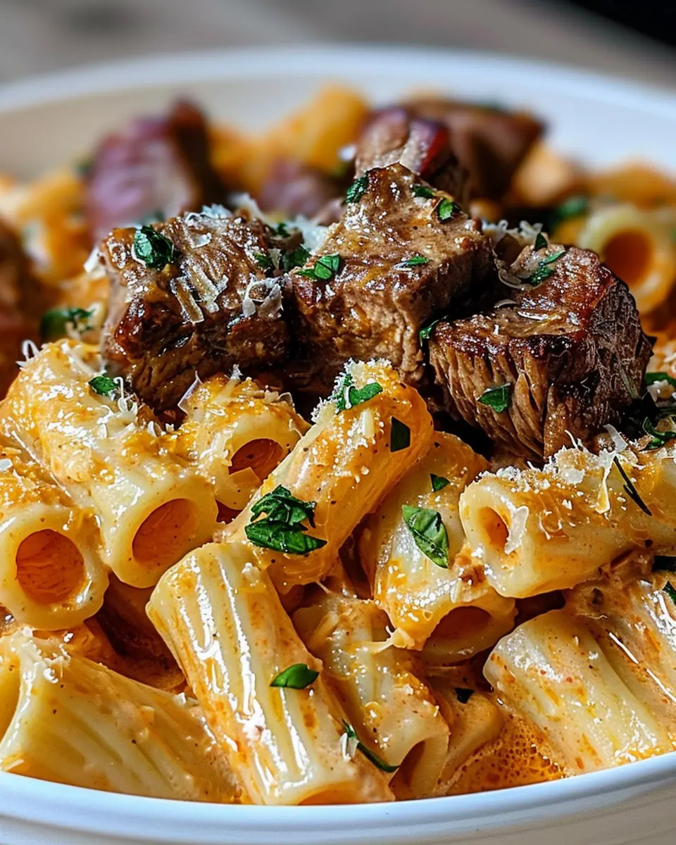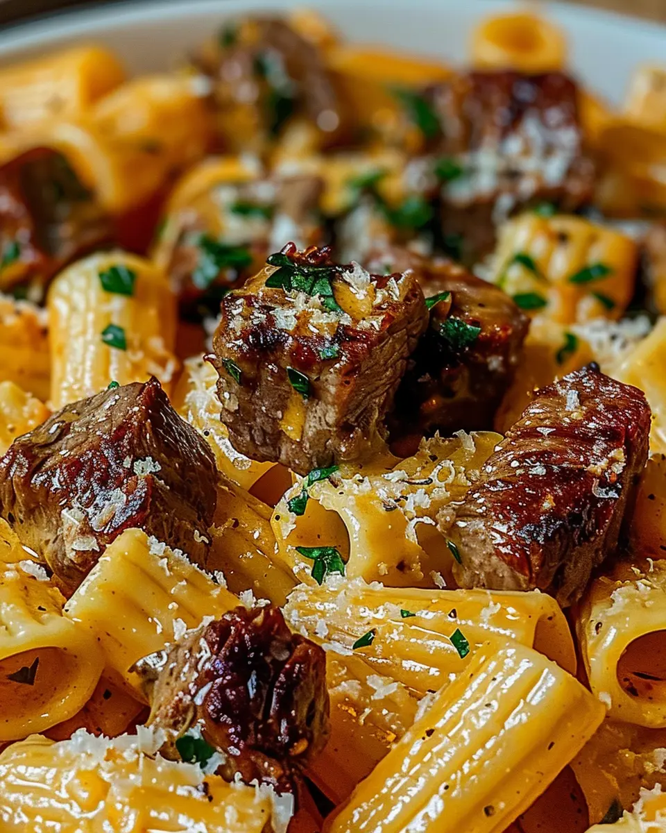 Cajun Steak Tips in Indulgent Cheesy Rigatoni Parmesan Sauce