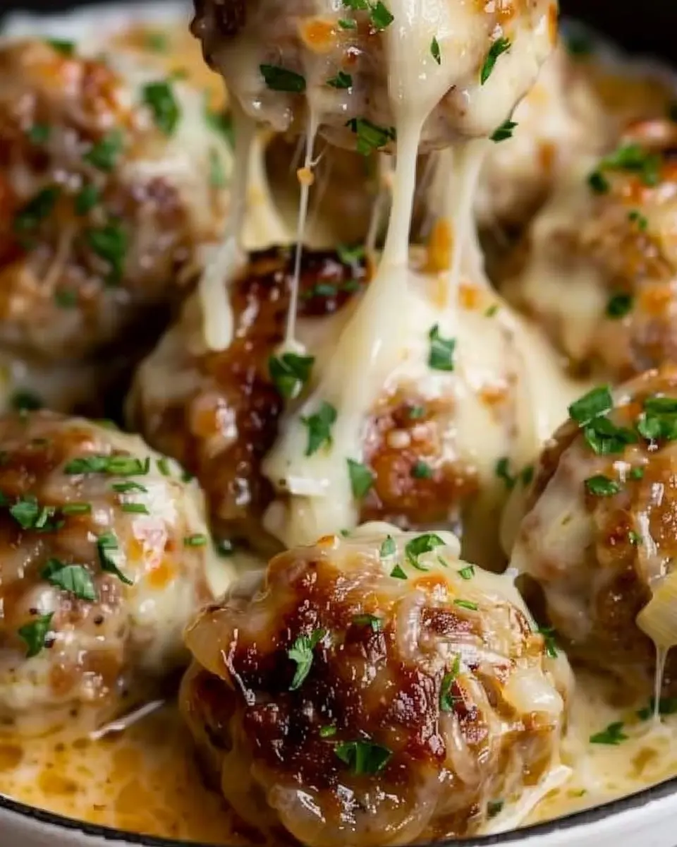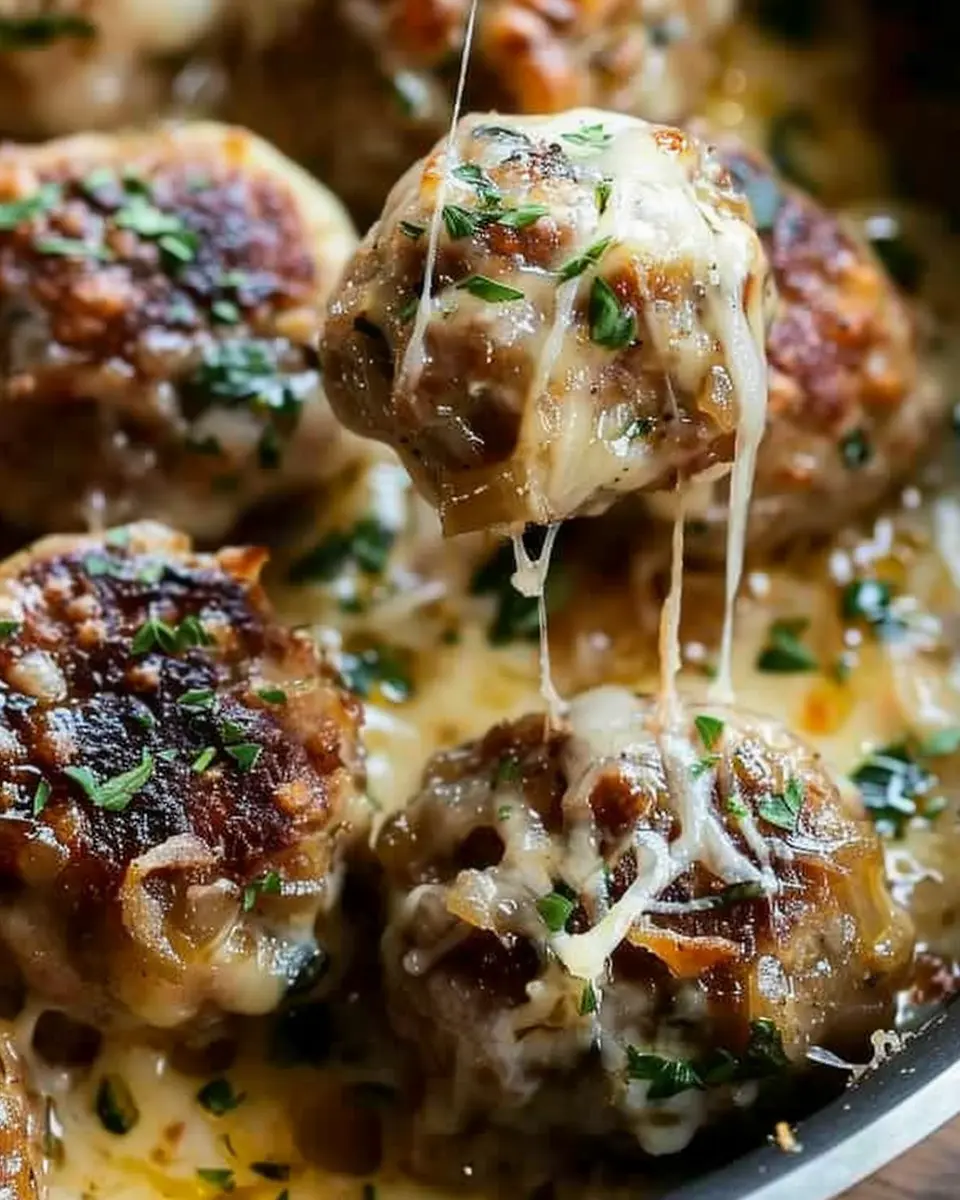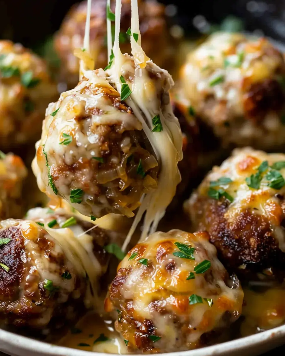 PrintCheesy French Onion Meatballs: Indulgent Bites with Turkey Bacon