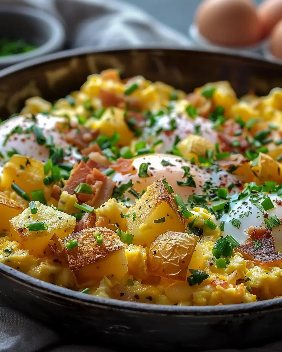 PrintCheesy Potato Egg Scramble with Turkey Bacon: A Cozy Breakfast Delight