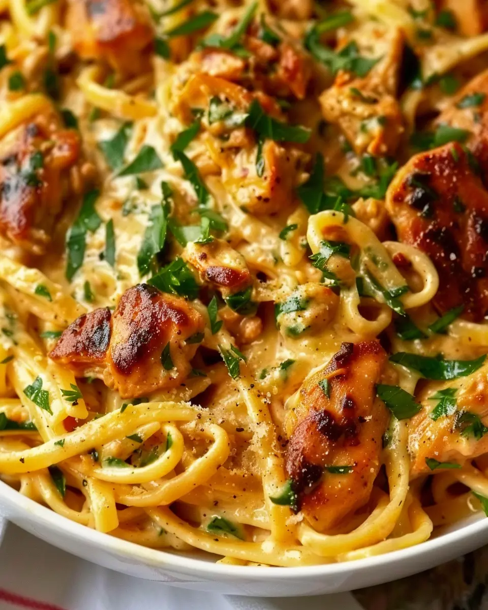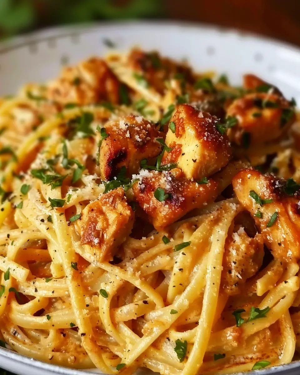 To finish off your cowboy butter chicken linguine, plate your dish and sprinkle fresh herbs and some grated Parmesan cheese on top. This final touch not only adds flavor but also makes your dish look exquisite.