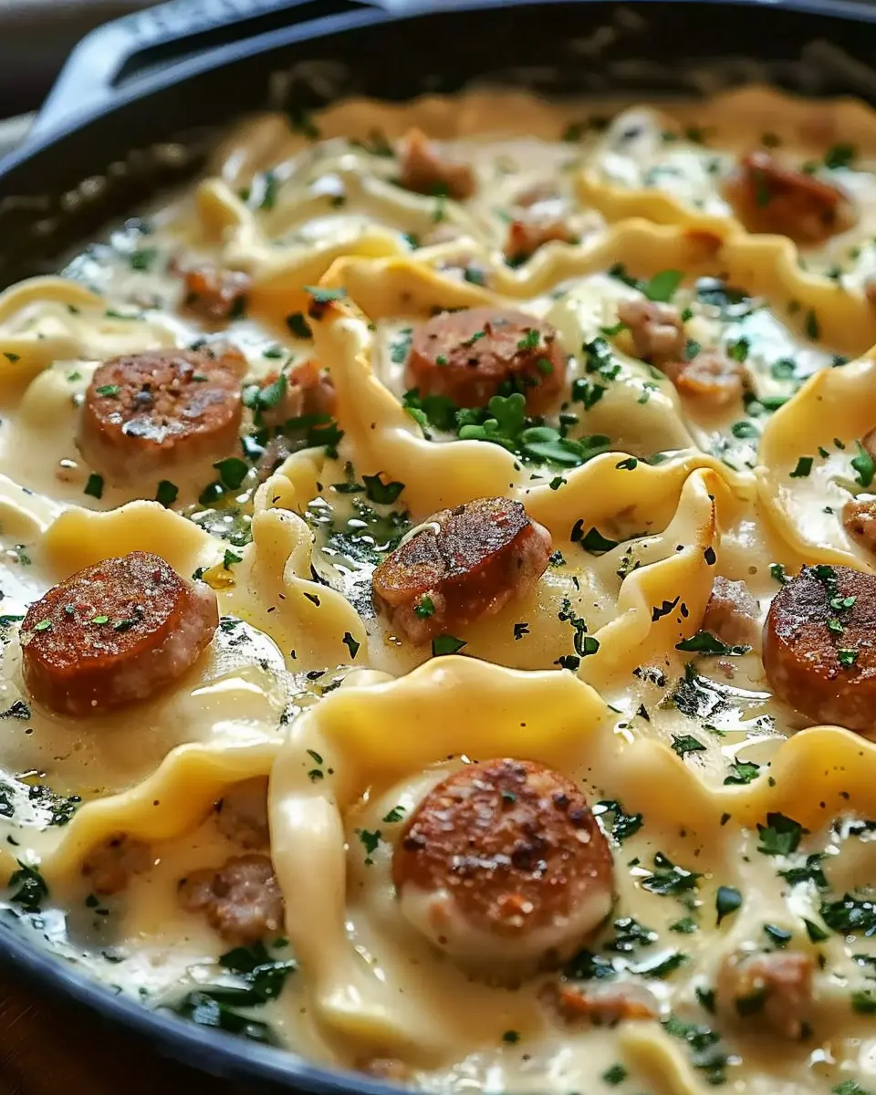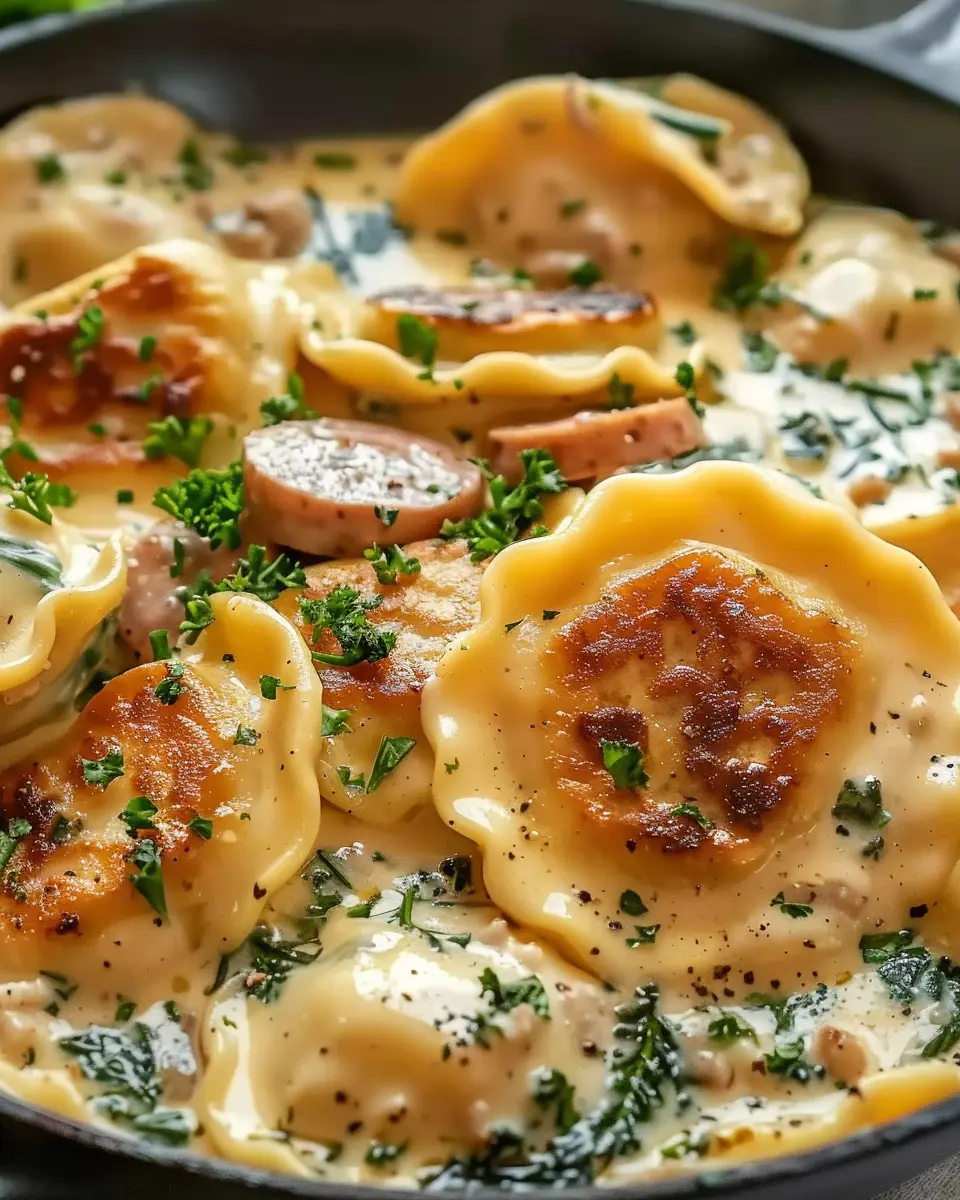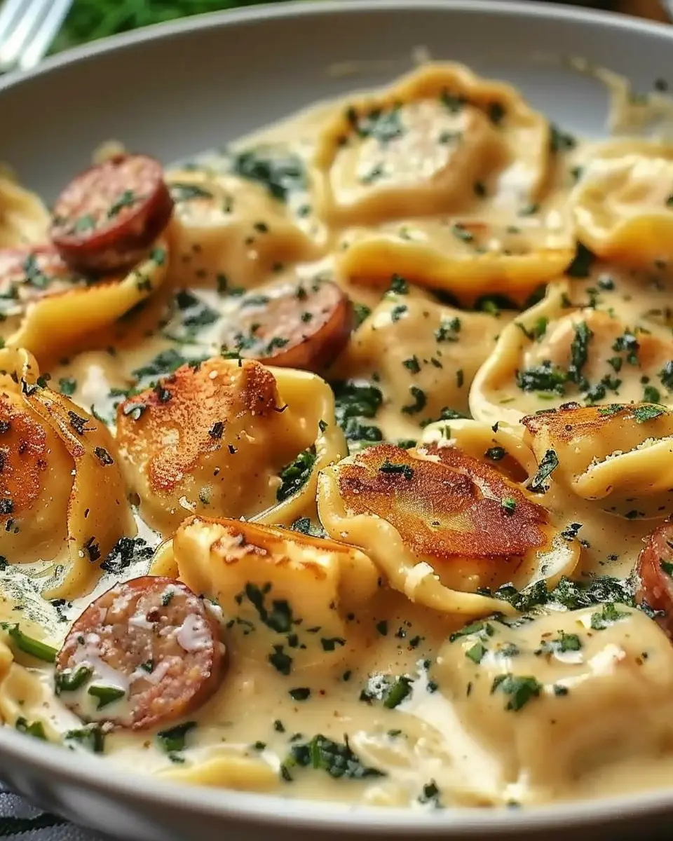 A delightful creamy dish featuring pierogi and turkey sausage, perfect for a quick weeknight dinner.