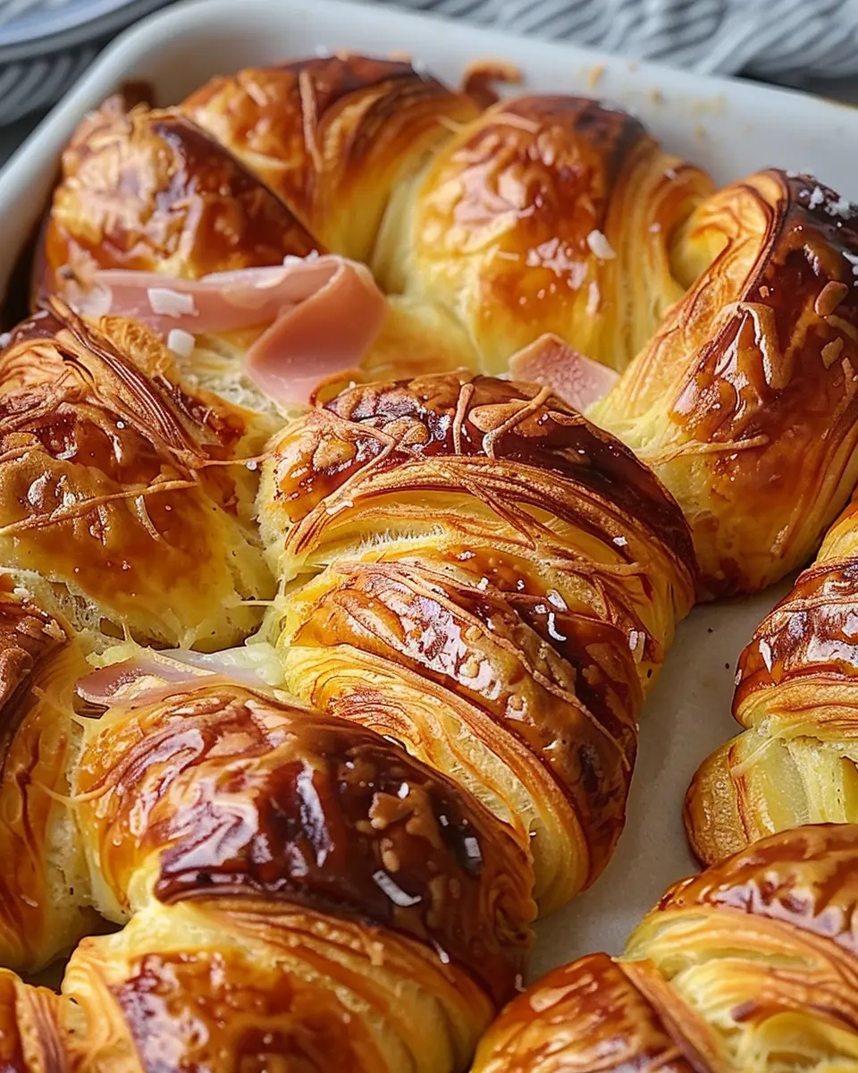 A delicious and hearty croissant bake that combines the savory flavors of turkey bacon and chicken ham.