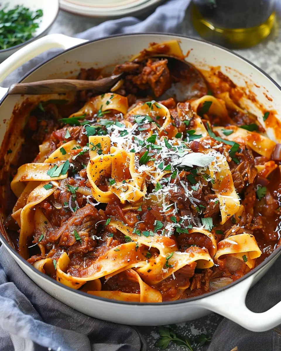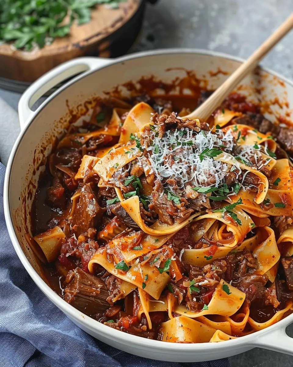 Indulge in the rich flavors of Dutch Oven Short Rib Ragu served with pappardelle, a perfect comfort food for any occasion.
