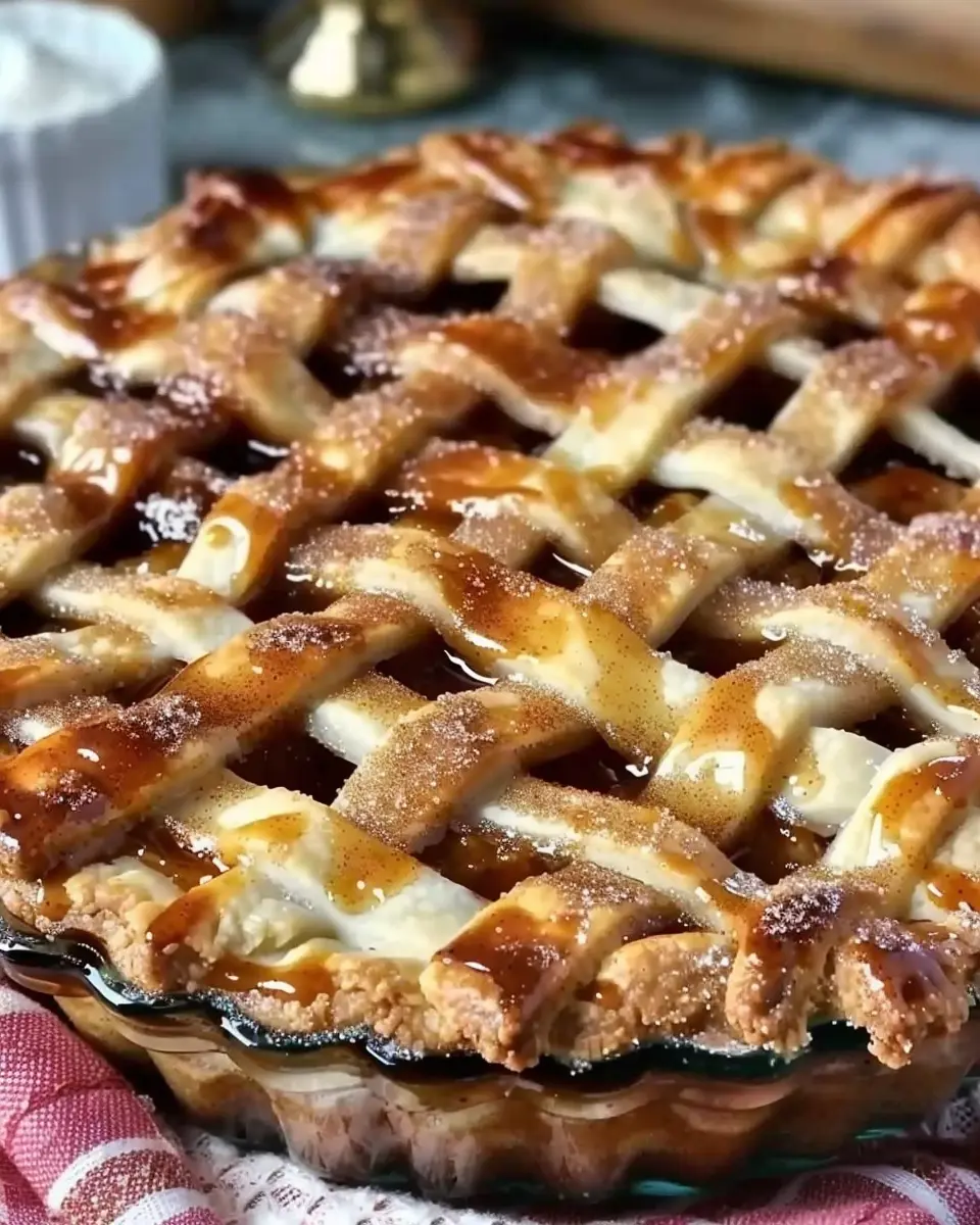 To get that gorgeous golden finish, whisk one egg with a tablespoon of water to create an egg wash. Brush the lattice crust and the edges of the pie with this mixture, then sprinkle a mixture of sugar and cinnamon over the top.