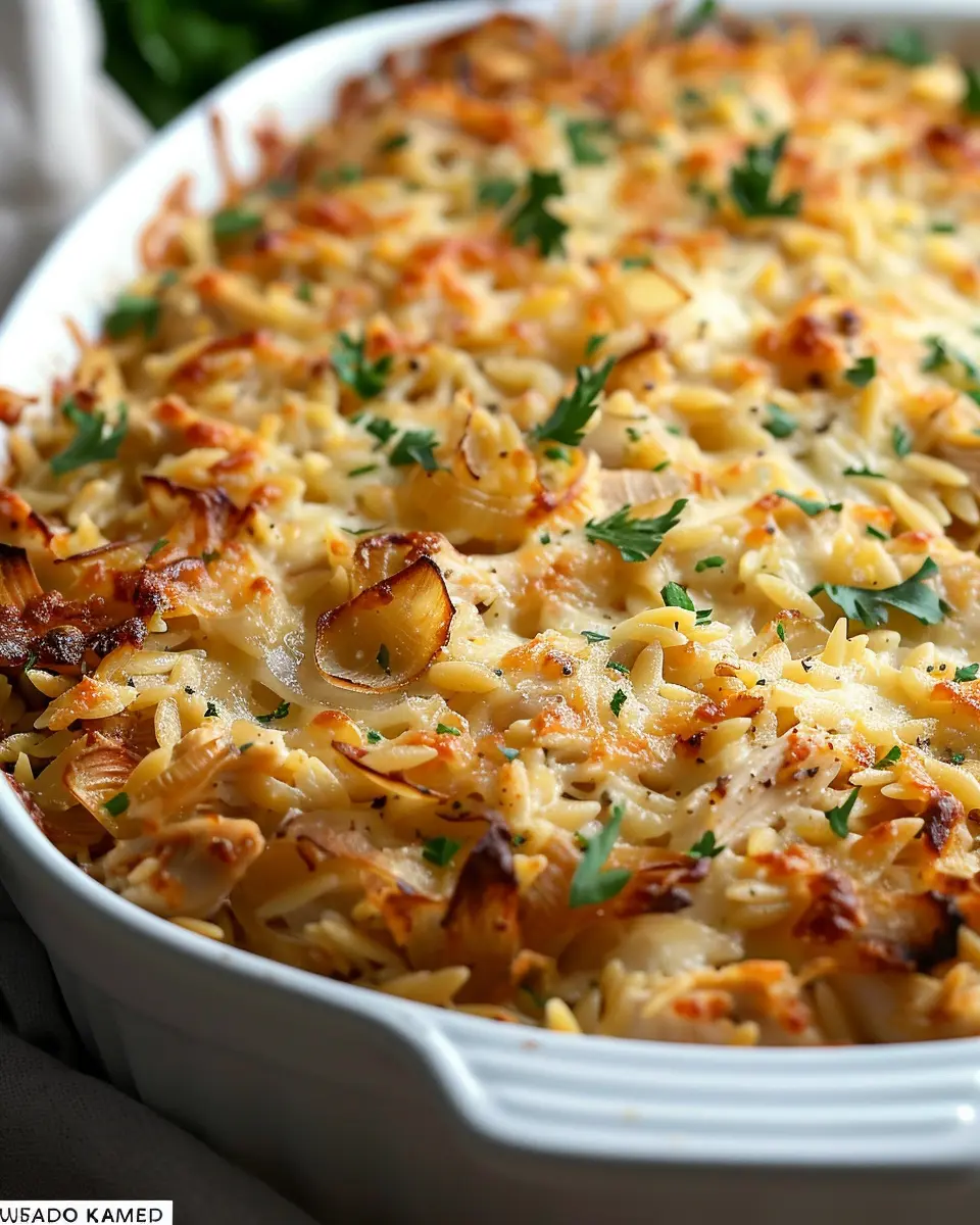 Deliciously creamy and comforting, this French Onion Chicken Orzo Casserole is made with savory turkey bacon, tender chicken, and flavorful orzo.