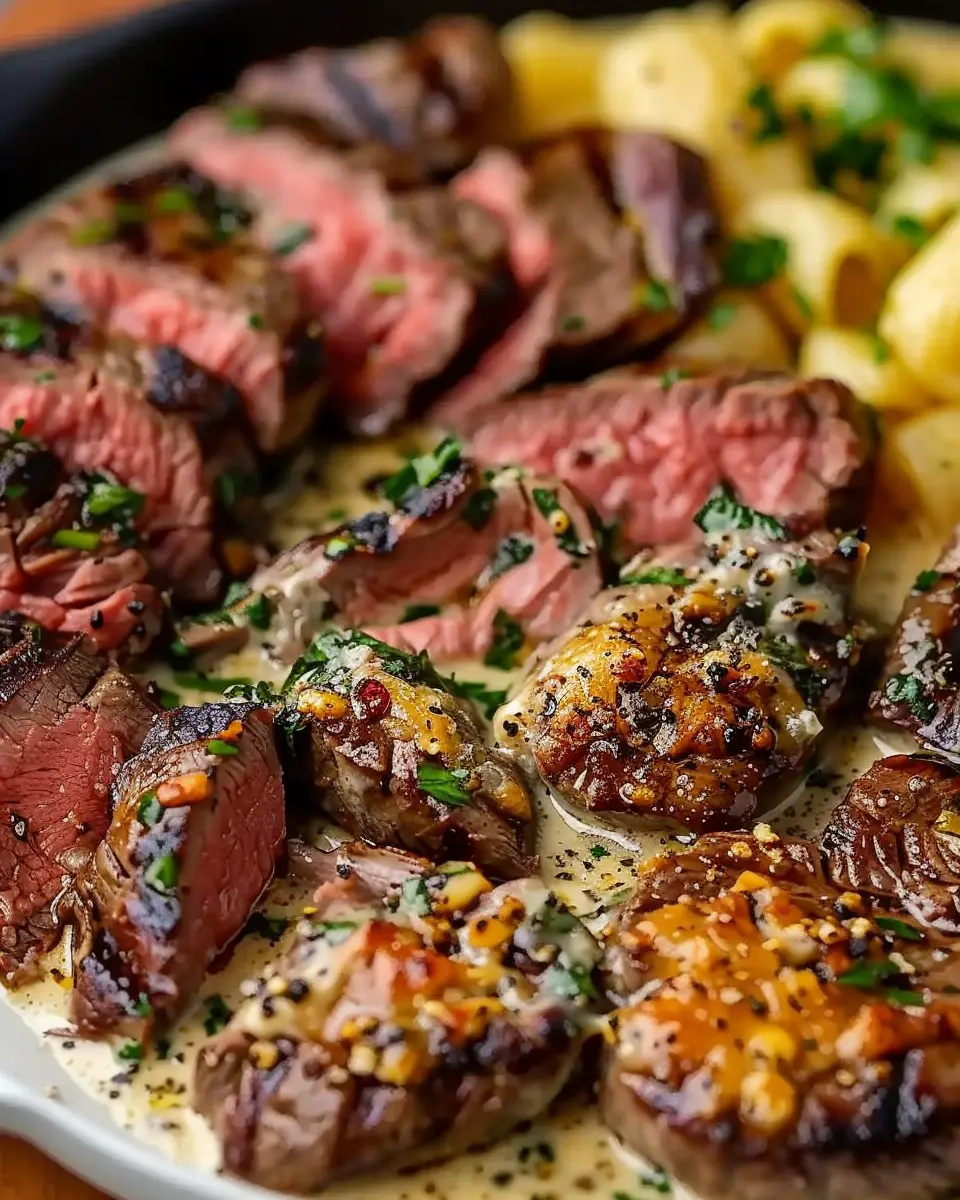 • Incorporate the tortellini and sliced steak into the creamy garlic sauce.