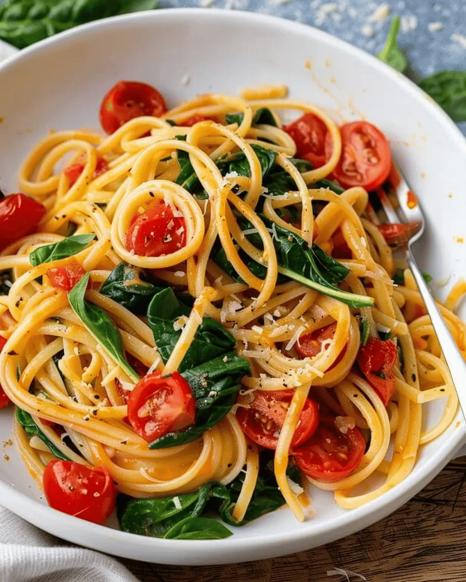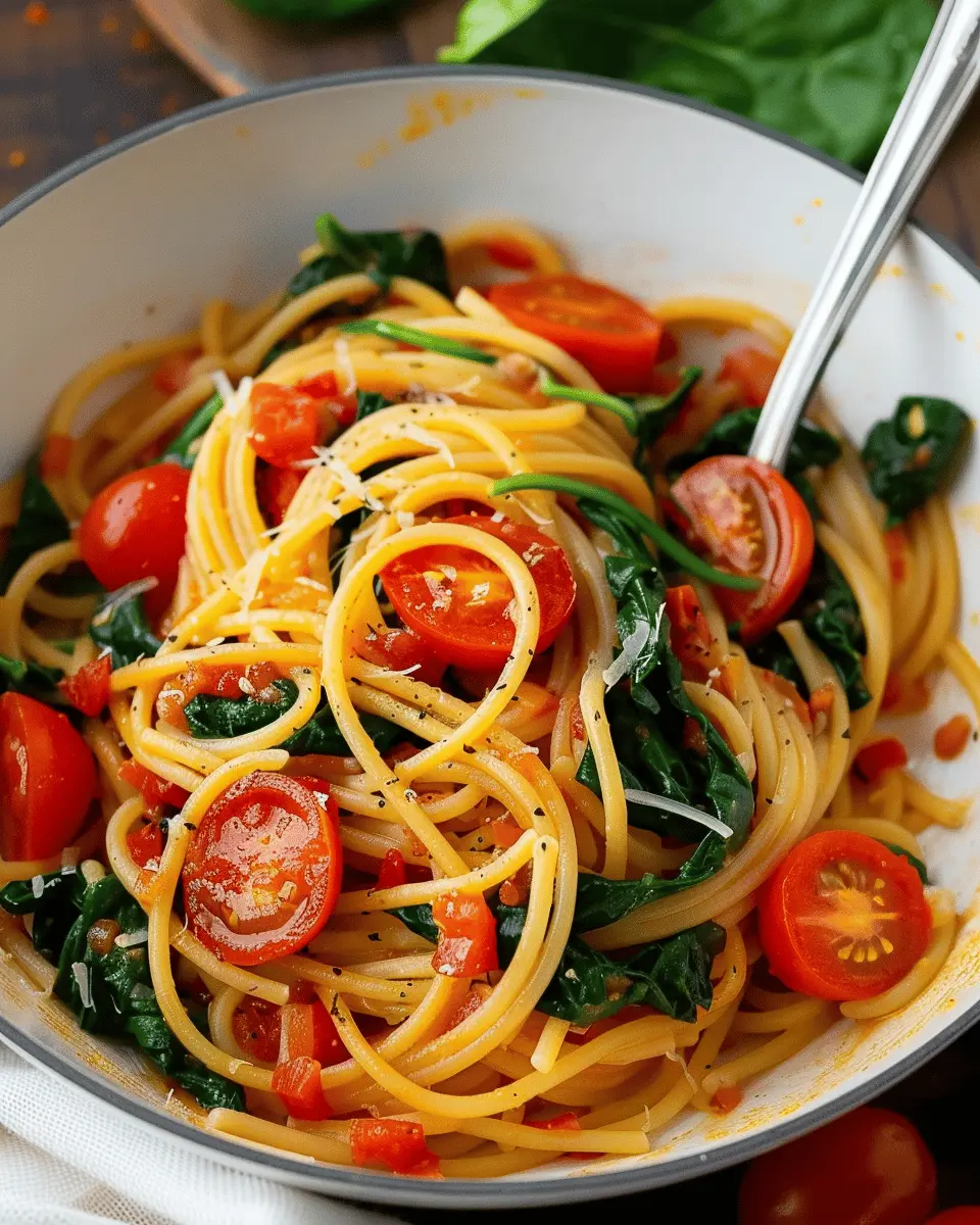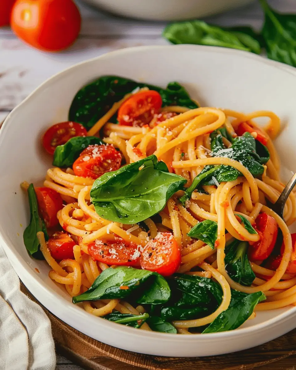 A delightful one pot pasta recipe combining spinach and tomatoes for a simple and comforting meal.
