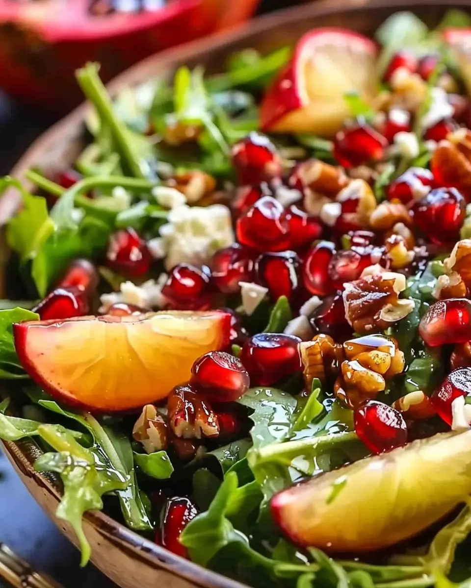 - In a large bowl, combine the mixed greens, pomegranate seeds, feta cheese, walnuts, and red onion.