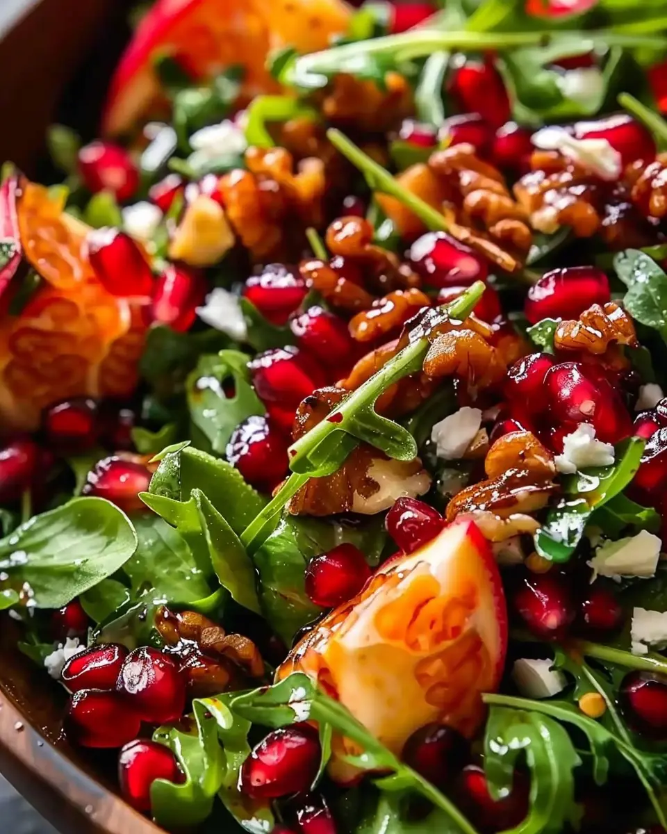 A refreshing and festive salad perfect for your holiday gatherings, featuring pomegranate seeds and a delicious honey mustard dressing.