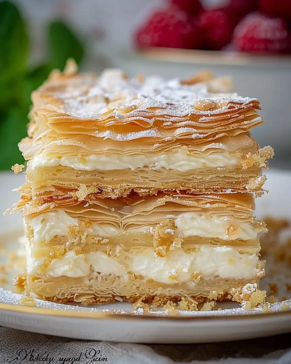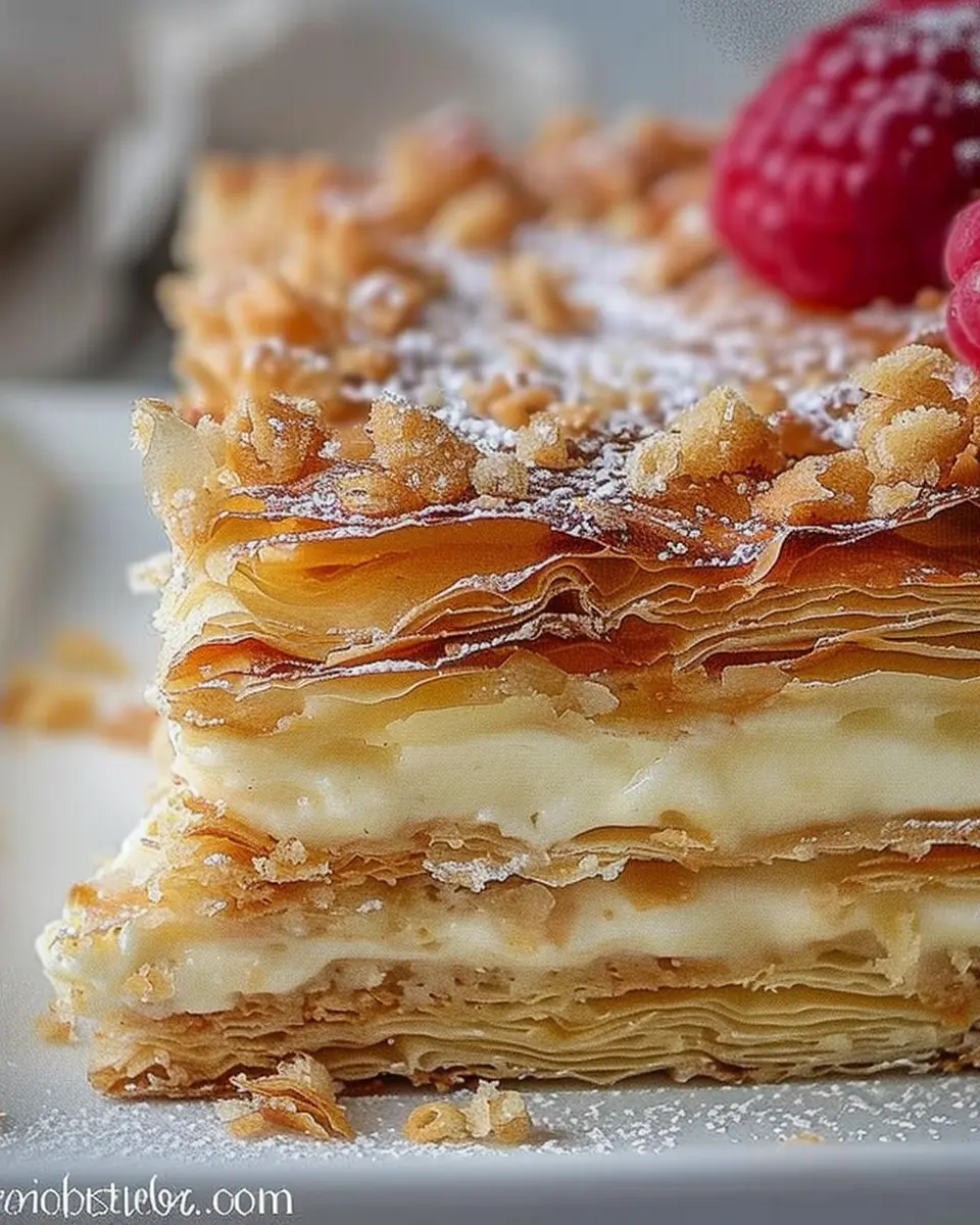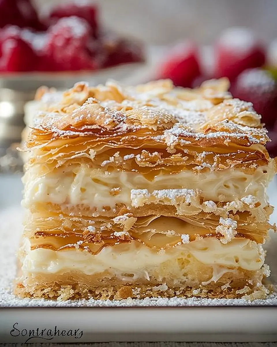 - Layer It Up: Start with one pastry layer, followed by a layer of custard. Repeat this until all the layers are stacked, finishing with a pastry on top. If you like, you can sprinkle some powdered sugar or crushed pastry for decoration.