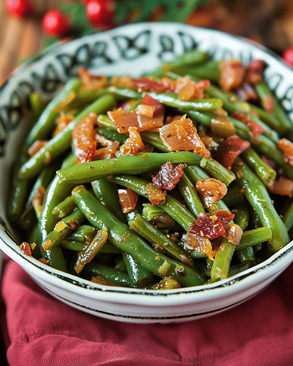 A delicious and comforting dish of green beans seasoned with turkey bacon.