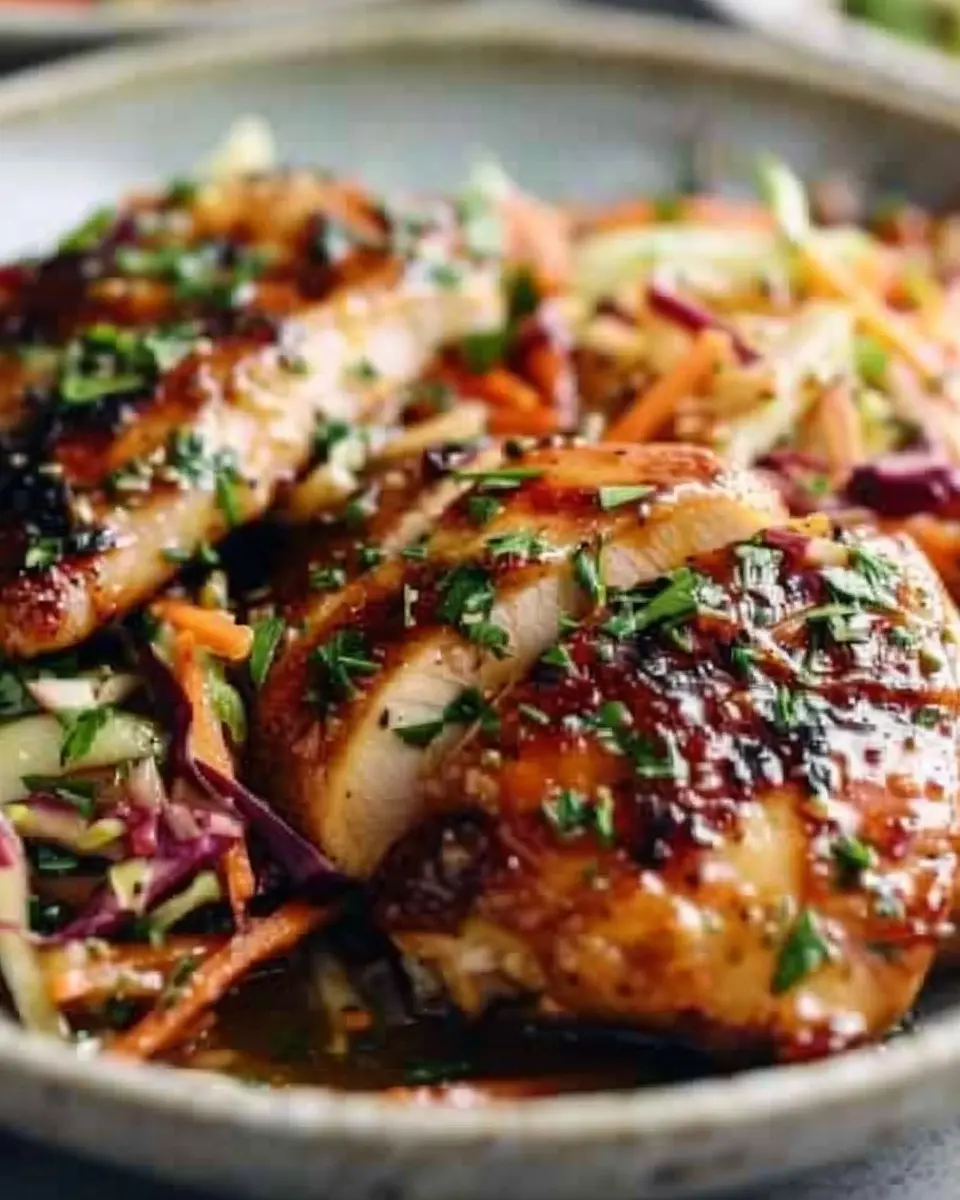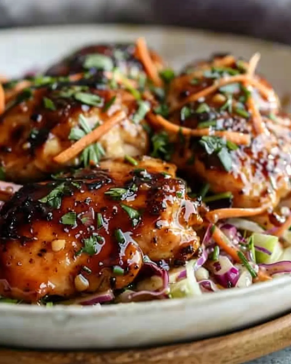 Now comes the fun part—plating your dish! Start by placing a generous scoop of the crisp autumn slaw on one side of the plate. Lay the sticky apple cider chicken next to the slaw, allowing any extra glaze to drizzle on the plate. For a touch of color, garnish with fresh parsley or additional nuts.