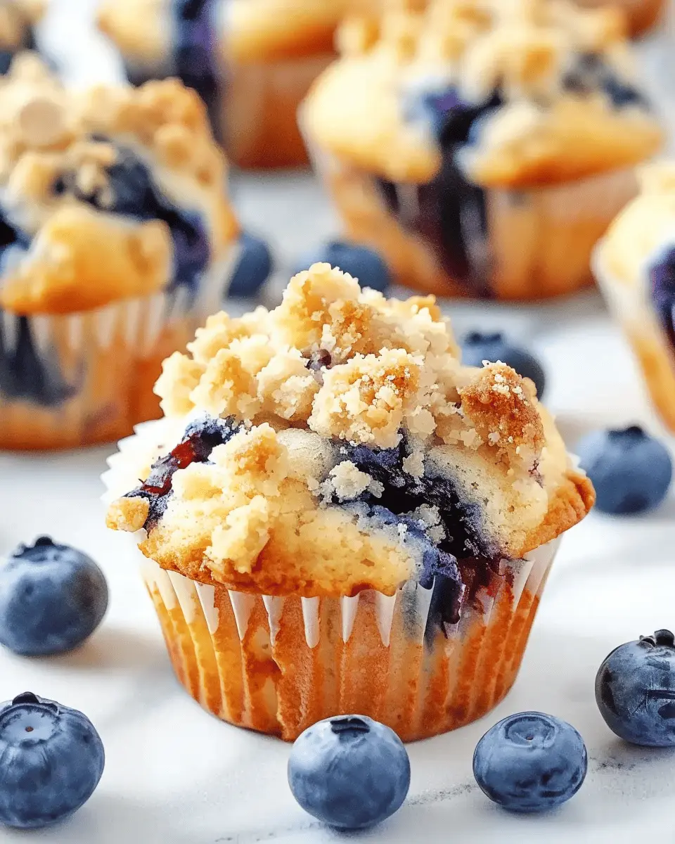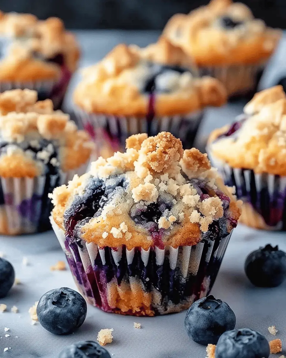 Enjoy these delicious blueberry muffins topped with a sweet crumble, perfect for a cozy morning.